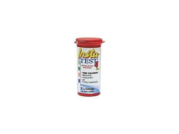 The Insta-TEST 4 Plus pool & spa strip measures Free Chlorine 0-10 ppm, Bromine 0-20 ppm, Total Alkalinity 0-240 ppm, pH 6.2-9.0, and Total Hardness 0-800 ppm