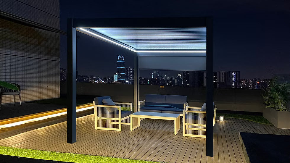 This compact pergola is tailor-made for smaller gardens, patios, or any area where space is at a premium but style and comfort are a must. Despite its size, it offers the same high-end features as our larger models, ensuring your outdoor space remains sophisticated and functional.